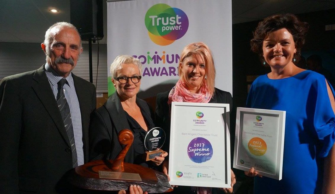 Bald Angels was the recent recipient of the Regional and Supreme Award for the Health and Wellbeing category at the 2017 Trust Power Community Awards in Kaitaia. Trustpower community relations representative Abbie Siely said “Bald Angels contributes to the wellbeing of more than 200 families and 1000 (Mid North) children every year through fundraising events that bring the community together in the in the spirit of generosity and goodwill.” The Trust received a framed certificate, a trophy and $1500 and will represent the Far North at the 2017 Trustpower National Community Awards in Queenstown in April. See the full stories: