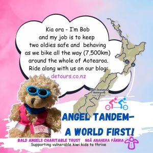 Crikey! …just packing that bike deserves a medal on its own, but they are about to tackle 7000km of Aotearoa’s back roads and highways, mountains and valleys with just what’s strapped on and NO back up support team – except Bob the Angel Bear who will keep an eye on them. What’s on the bike is everything they need for 4 long months on the road.